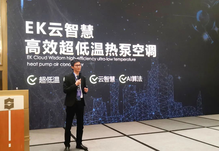 本(běn)次會議(yì)以“低碳設計,智慧運行”為主題,圍繞建(jiàn)築環境營造(zào)低碳技術、近(jìn)零(líng)能耗建築、清潔供熱技術與設備、智慧能源等國內外熱點方向開展研討交流。EK空調產(chǎn)品經理陳(chén)旭金(jīn)以《EK雲智慧高效超(chāo)低溫熱泵空調》為主題發表演講,和現場嘉賓介紹了普通風冷熱泵和超低溫空氣源熱泵(bèng)的區別、EK超低溫熱泵的(de)發展曆(lì)史、產品陣容、係統優(yōu)勢以及在嚴寒地區各行業的應用案例。