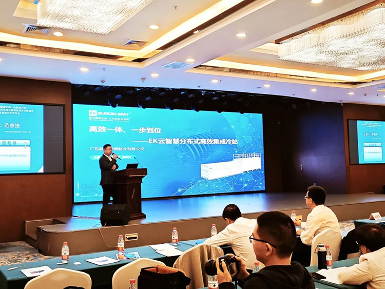 年會現場,EK空調大型冷(lěng)水機事業部徐楓林(lín)以《高效一(yī)體、一步到位——EK雲智慧分布式高效集成冷站》為題發表演講,和現場嘉賓重點介紹了EK高效機房係統(tǒng)核心產品——雲智慧(huì)分布式高效(xiào)集(jí)成冷站的組成、特點、優勢、應(yīng)用場景和(hé)項目案例。
