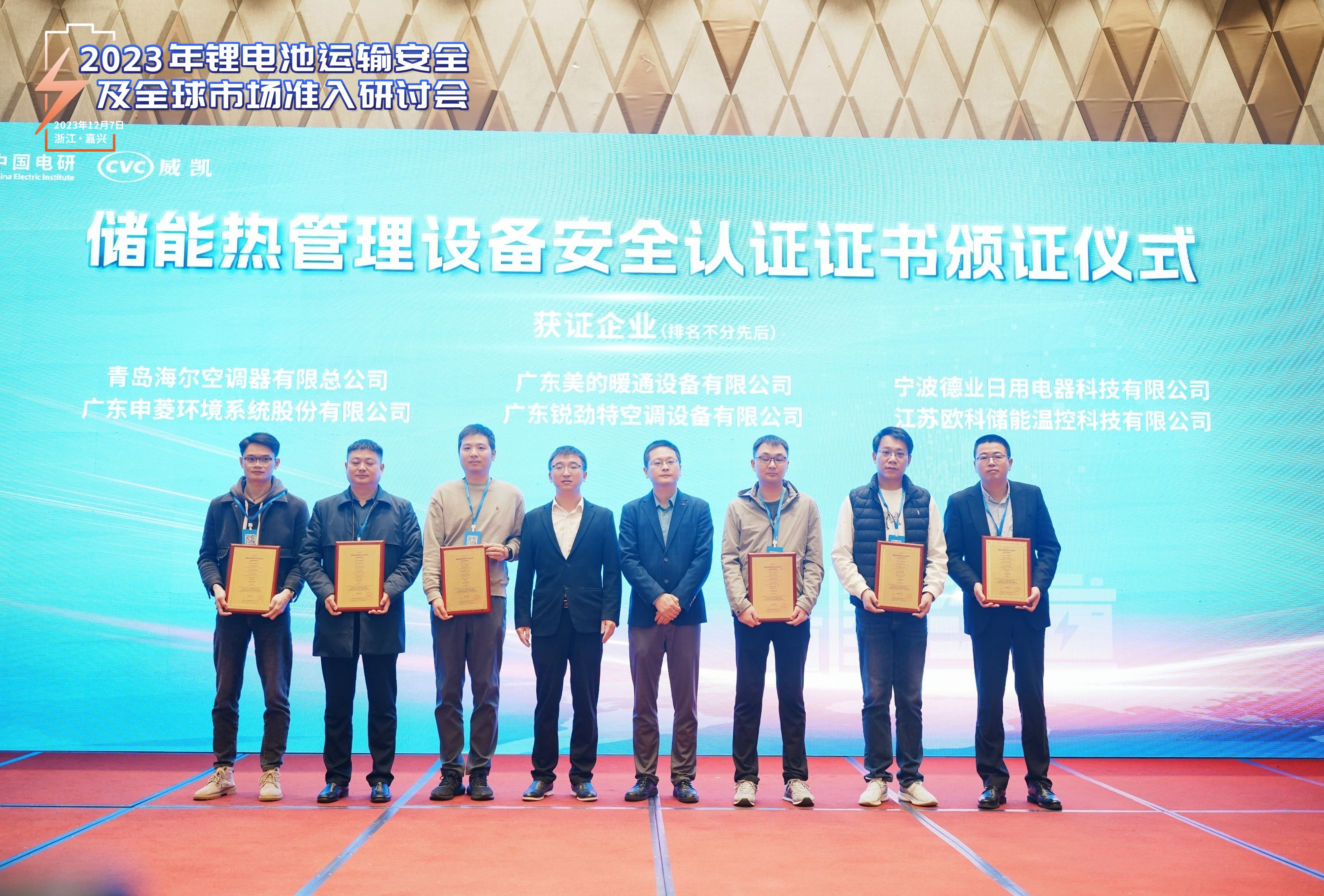 EK以其高(gāo)效、節能、智能化(huà)的儲能溫控係統產品贏得了行業廣泛認可。此(cǐ)次大會上(shàng),公司成功通(tōng)過了中國電研(yán)CVC威凱頒發的首批儲能係統熱安全認證,再次彰顯了其在儲能領域的卓越地位和技術實力(lì)。