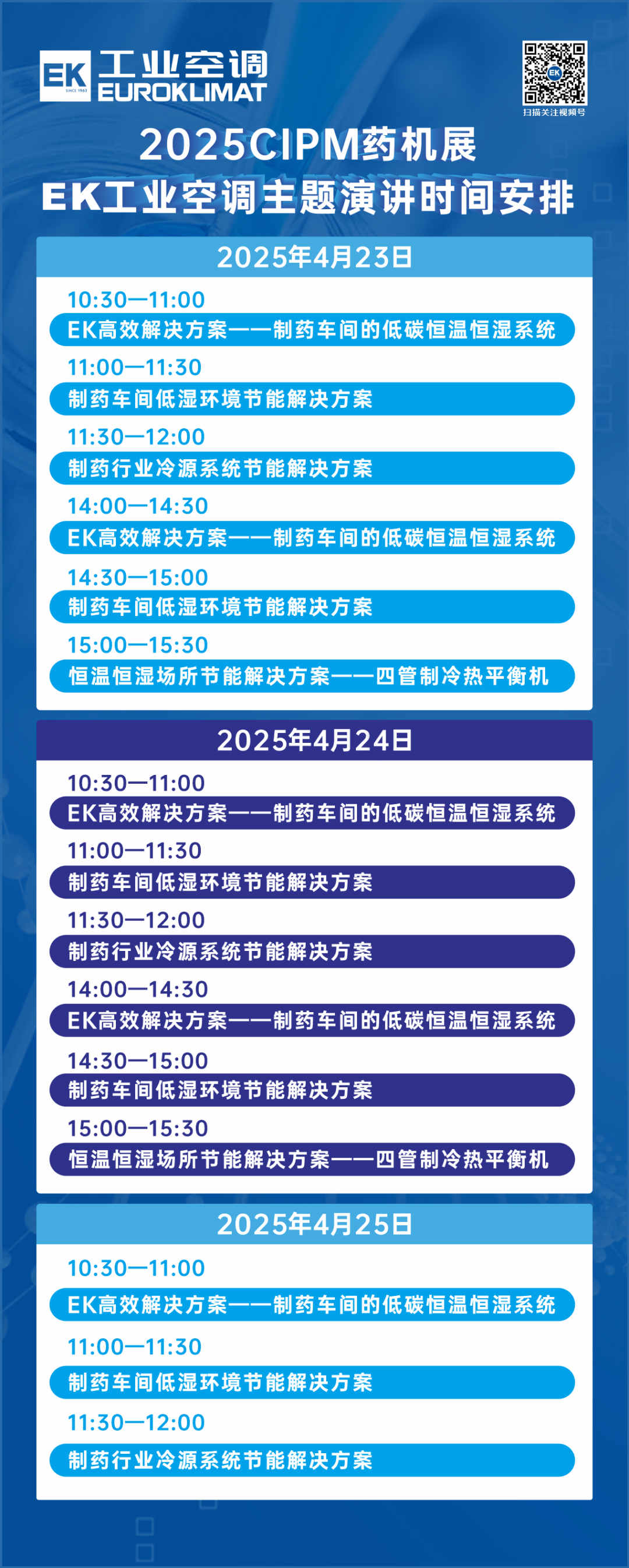 展會熱度持續攀(pān)升,精彩遠(yuǎn)不止於此!本屆藥機(jī)展將持續到4月25日,EK工業空調誠邀您蒞臨國際三館 S3-59 展位,共探製藥行業節(jiē)能降耗、綠色發展(zhǎn)路徑!