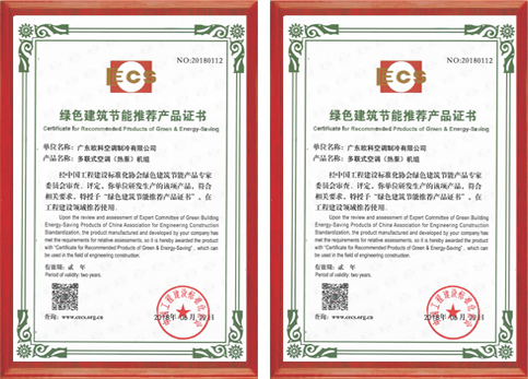綠色建築節能推薦產品證書-多聯式(shì)空調